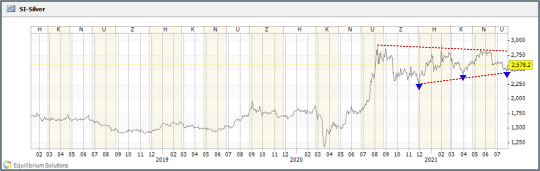 Here we have a clearly defined uptrend from late 2018 to August 2021 after which we get a downward-sloping consolidation channel. This is usually a bullish pattern, but often one that strains patience. It also included a sharp drop in late February which made the ‘consolidation’ appear like a bearish reversal. By now however, we have three successively higher troughs and a breaking of the downward-sloping resistance that formed along with the consolidation pattern. Again, I-System strategies produced a similar reading of the picture which now abundantly justifies taking the risk on Gold and Silver.
