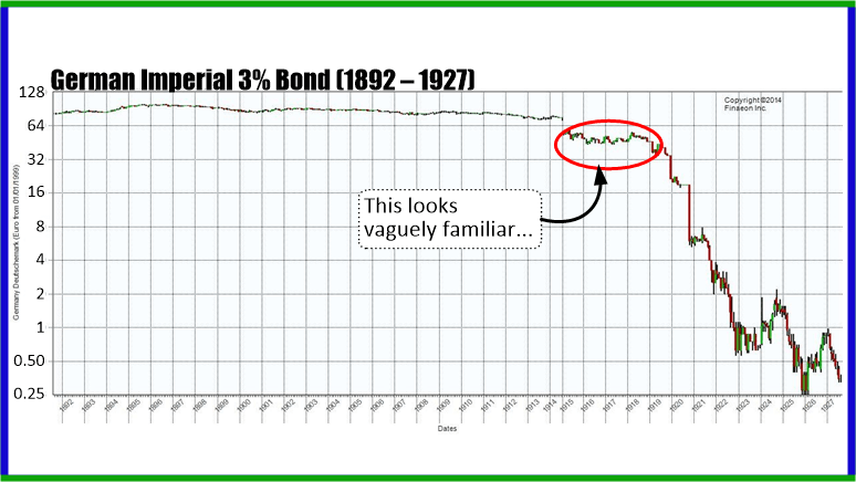 Our next question is, how bad could it get? Certainly, a substantial increase in interest rates and further decline in treasury prices are all but certain. A few years ago I came across the chart of the German imperial bond between 1892 and 1927. I think we should not draw any definitive conclusions from what happened in Germany one hundred years ago, but this shows the extreme consequences of the financial and economic imbalances plaguing a fallen empire.
