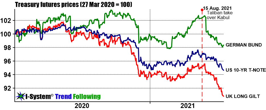 Leaving the complexities of economics and geopolitics aside, let’s have a glance at how the markets have been reacting to the changing circumstances. Only days after the Taliban took Kabul the prices of western nations’ Treasury bonds began to decline sharply. But among the major powers, it was the British debt that has been losing ground most rapidly. The chart below shows the comparative performance of the UK, US and German treasury bonds:
