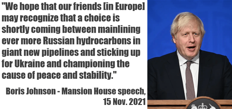 Recall, it was Johnson who issued this warning last November: “We hope that our friends [in Europe] may recognize that a choice is shortly coming between mainlining ever more Russian hydrocarbons in giant new pipelines and sticking up for Ukraine and championing the cause of peace and stability.” That was only a day after the outgoing head of the UK Chief of Defence Staff, General Sir Nick Carter declared that the UK military would have to be ready for war with Russia.