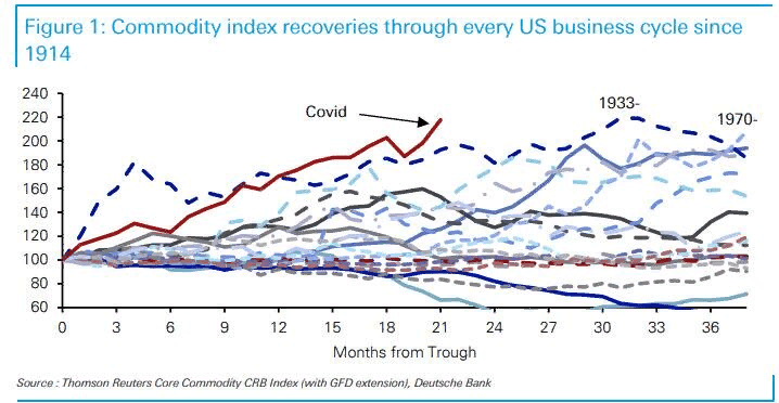 Well, commodity prices have been rising lately (though not yet Gold and Silver), providing yet another corroboration of their merit as an inflation hedge. Recent research from Deutsche Bank’s Jim Reid also suggests that this time could be somewhat different: the current commodities cycle has so far been the strongest on record, eclipsing all of the previous 20 cycles since 1914 , as the following chart shows: