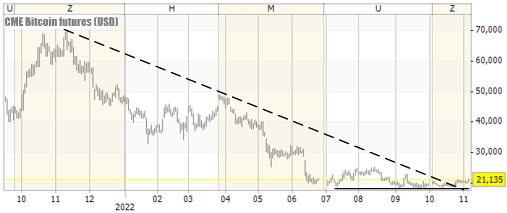 The trade is not be about getting the prediction right. Rather, it’s about considering and planning a tactical long trade from the present levels. A rally, if it takes off, could easily reach the next resistance level at about $30k or even $40k – $50k. On the down-side, we can guess that the present support level will hold, at least temporarily, and set our stops just below $18k. As I write these lines (Monday, 7 Nov. 2022 at 14:40 GMT), Bitcoin is trading at $20,746. The resulting trade would have roughly $10k to $30k up-side and less than $3k to the down-side.