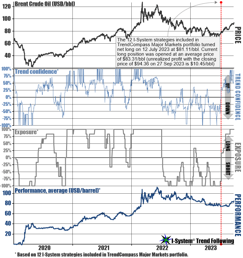 It’s a busy chart for sure, but what it shows is the price of Brent Crude Oil contract, I-System’s trend confidence function, our exposure based on the 12 strategies, each trading a single contract of Brent Crude, and the trading performance of these signals.