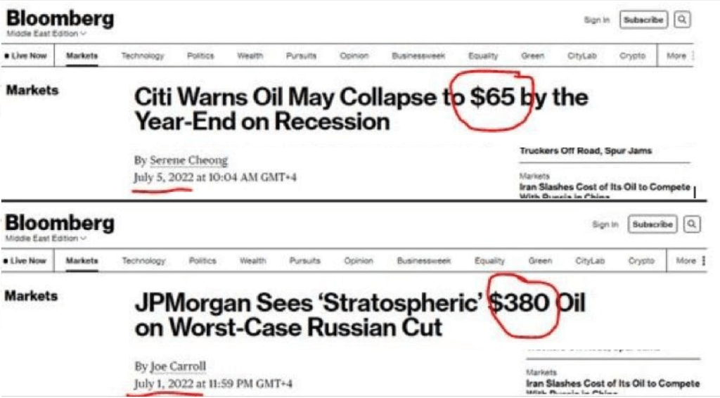 ZeroHedge headline read, “US Shale Giant Agrees With JPMorgan: Oil Headed For $150.” Without a doubt, had the price of Crude Oil crashed, we’d have a slew of articles and commentary explaining all the reasons why that had happened. It calls to mind these two articles, published by Bloomberg on the same week last summer and showing a very different forecast from JPMorgan: