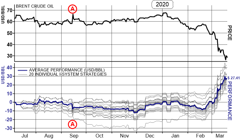 “A” marks the largest recorded 1-day oil price jump. On Saturday, 14 Sep. 2019, a missile attack in Saudi Arabia caused substantial damage to Aramco’s Abqaiq oil production facilities. The following Monday, oil price closed $8.42/bbl above previous Friday’s price. Of course, I-System strategies didn’t ‘know’ this would happen and held 60% short exposure at the time. As a result, the portfolio sustained a $5.80/bbl average loss (4 out of 20 strategies had long exposure).