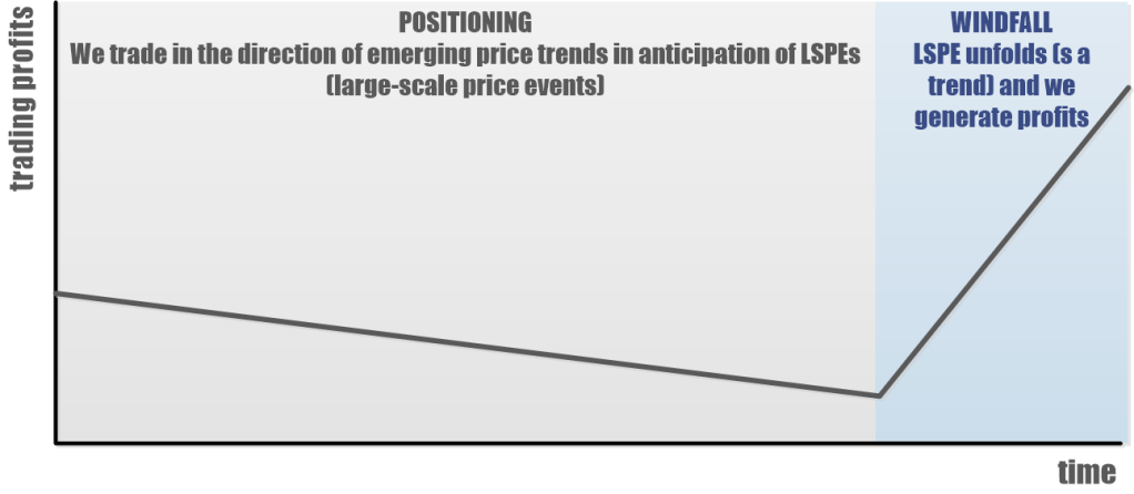 Trends don’t announce themselves in advance. In fact, LSPEs (large-scale price events) are by definition unpredictable. To profit from them we need to be in the right position at the right time and this positioning involves risk-taking and incurring some losses until the trend takes off. This is precisely what the above charts illustrate.