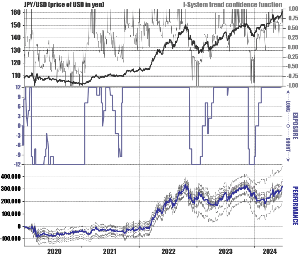 The top panel of the chart shows the price of US dollar in yen (left scale) overlaid with the I-System trend confidence function (right scale). Trend confidence fluctuates between 1 (certainty that we’re in an uptrend) and -1 (certainty that we’re in a downtrend). The middle panel shows net exposure generated by the 12 selected strategies (at -12 we’re 100% short the US dollar against the yen; and at 12 we’re 100% long). The bottom panel shows the strategies’ performance in yen, each trading a single 5 million yen position.